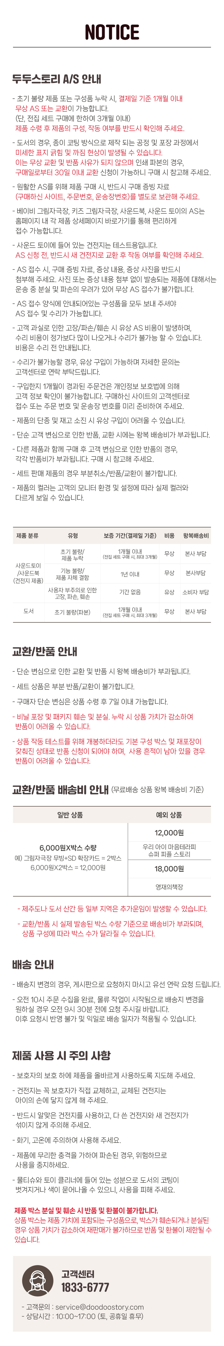 상품의 불량에 의한 반품, 교환, A/S, 환불, 품질보증 및 피해보상 등에 관한 사항은 소비자분쟁해결기준(공정거래위원회 고시)에 준하여 처리됨.